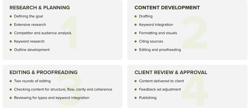 Unlike other content marketing services providers that outsource most of their content, we keep our content in-house to control the quality of the content from start to finish. We have 20+ content experts – writers and editors included – working together to deliver the highest quality content.
